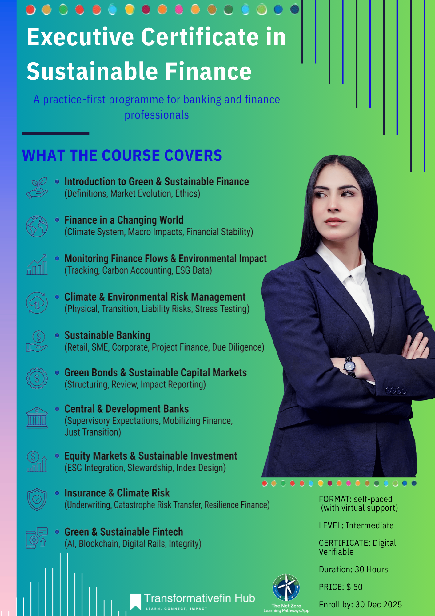 Become the professional who can translate climate ambition into capital allocation. This executive certificate is a practice-first, globally balanced program that equips bankers, investors, policymakers, and students to structure sustainable finance solutions, monitor finance flows, manage climate and environmental risks, and report decision-useful impact.